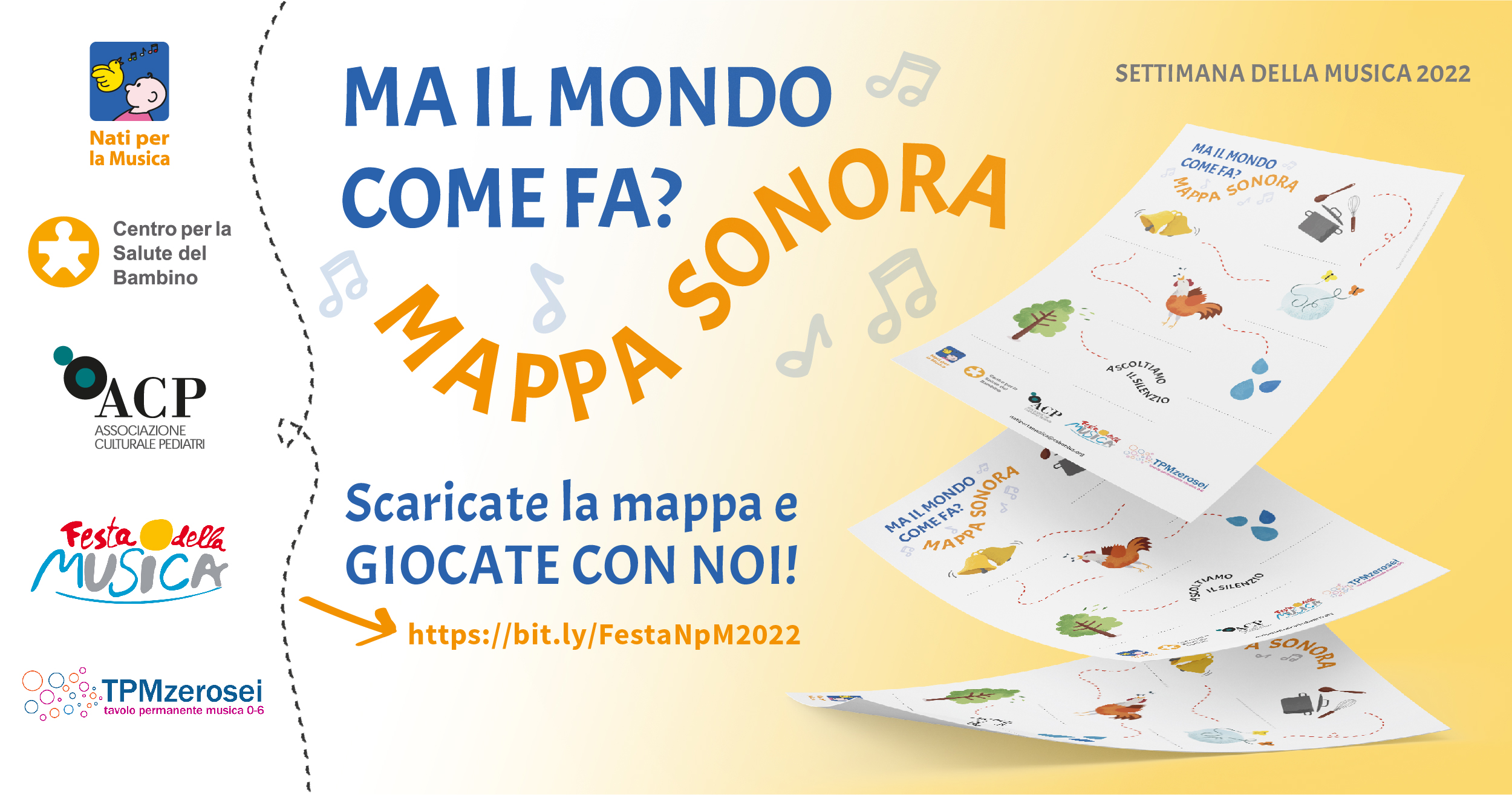 A questo link https://bit.ly/FestaNpM2022 potete scaricare la Mappa Sonora a colori e in bianco e nero e le relative istruzioni. Troverete appunto anche una mappa “personalizzabile” per favorire una libera mappatura sonora del territorio, che permetta di individuare anche suoni e oggetti sonori diversi da quelli indicati dal Programma NpM.
