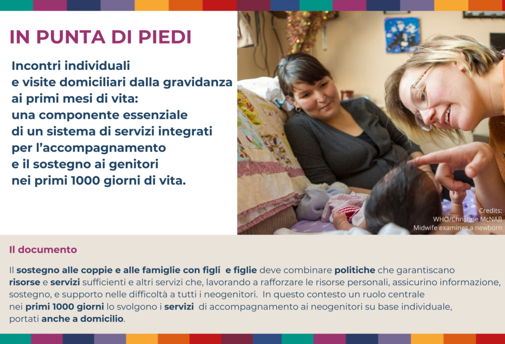 Il CSB ha coinvolto diverse figure professionali, servizi ed entità pubbliche e del Terzo Settore che si sono impegnate a offrire servizi basati su visite domiciliari in un lavoro di confronto tra esperienze, riesame della letteratura per lo sviluppo di “In punta di piedi” un documento di indirizzo che si colloca in una prospettiva di diventare un LEP(S) o parte di un LEP(S) sui primi 1000 giorni.