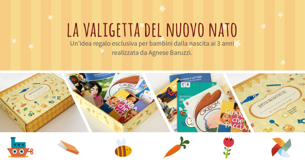All’interno della valigetta in cartone rigido disegnata da Agnese Baruzzi troverai un contenuto prezioso per iniziare una relazione ricca di stimoli con il tuo bambino: